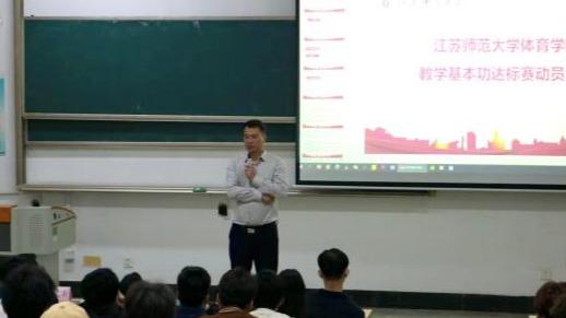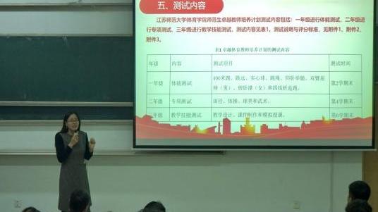 随后,邹吉玲主任将《江苏师范大学体育学院师范生“卓越教师培养计划”实施方案》进行解读,明确三个年级的考核内容与要求。一年级进行体能测试,包括400米跑、跳远、实心球、跳绳、仰卧举腿、双臂屈伸(男)、俯卧撑(女)和四线折返跑。二年级进行技能测试包括田径、体操、球类和武术。三年级进行教能测试包括教学设计、课件制作和模拟授课。并解读了师范生基本功达标赛的比赛内容。主要包括基础知识与应用、通用技能和专业技能三部分,其中,基础知识与应用包括教师资格证考试和教案书写考试。通用技能包括粉笔字、钢笔字、口语表达和模拟授课等。专业技能根据学生所学的专项确定比赛内容。