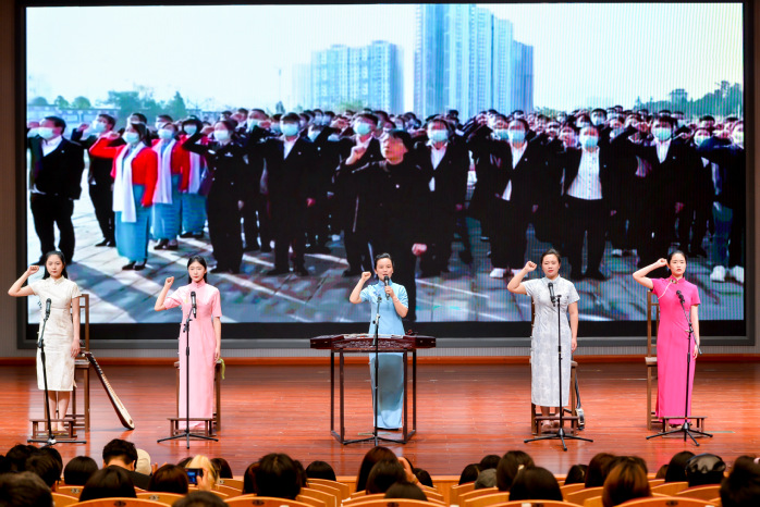 4月17日下午,音乐学院在马可音乐厅隆重举行了“信念 仁爱 荣光”党建与师德师风实践教育之徐州琴书《时代楷模张桂梅》专场活动。徐州市文联党组书记殷召辉,校党委常委、组织部部长、统战部部长黄德志,徐州幼儿师范高等专科学校音舞学院书记丰娴静,徐州幼专学校产业教授、国家一级演员徐妮娜,徐州幼儿师范高等专科学校音舞学院副院长闫兵,校宣传部副部长张传琳,校党委教师工作部副部长潘映铼及音乐学院全体教师和音乐教育专业研究生、本科生400余人共同参加了整场活动。