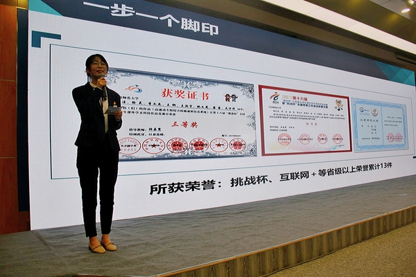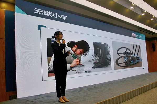 在三分半的风采展评时间,郭洁以无碳小车的尝试、加入科研小组、研发第一代虚拟仿真产品、走进微软创新杯、建设虚拟仿真数据库为线索向在场师生讲述了自己的科研成长之路,让我们看到她科研成果背后的拼搏奋斗。风采展平现场,郭洁同学表现亲切自然,获得了现场师生的阵阵掌声。