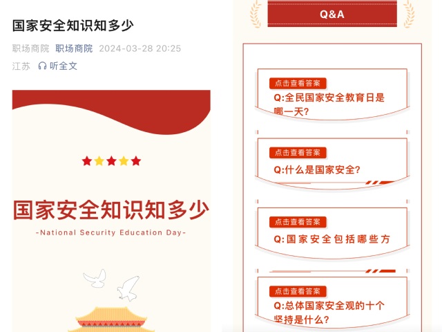 组织全体教职工观看宣传片《创新引领·国安砺剑——十大公民举报案例》专题展播,以案说法,加强国家安全意识,提升对国家安全的法治化认知,筑牢新时代安全防线。召开“增强国家安全意识,共同维护国家安全”主题班会活动,引导青年学生了解国家安全的重要性,进一步增强国家安全意识。组织学生参加“全国大学生国家安全知识答题”活动、在线学习“国开大讲堂·国家安全教育公开课”,引导学生坚定维护国家政权安全、制度安全、意识形态安全,营造国家安全人人参与、人人有责的浓厚氛围。拓展宣教阵地,在微信公众号“职场商院”推送《国家安全知识知多少》,重点就国家安全包括哪些方面,公民维护国家安全的权利和义务等内容,采用问答的形式在线上向全体师生开展国家安全教育。利用电子大屏,滚动播放主题宣传海报,在学院办公区走廊张贴海报,形成宣传矩阵,营造依法维护国家安全的浓厚氛围,推动总体国家安全观教育落地生根。