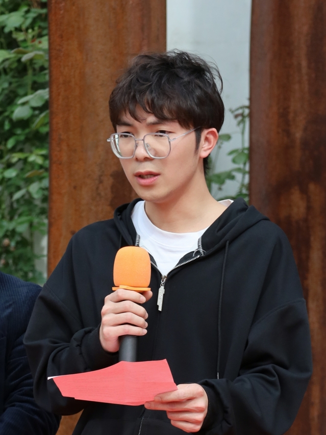 蔡游生同学代表2022级全体研究生向精心栽培的母校、悉心教导的老师、耐心陪伴的父母以及热心帮助的同学致以敬意和感谢,他回顾了一年多来的实践创作历程,有困难重重更有收获满满,同学们定不会辜负学院的培养,在创作的道路上砥砺前行,创作出更有高度、更有深度的作品。