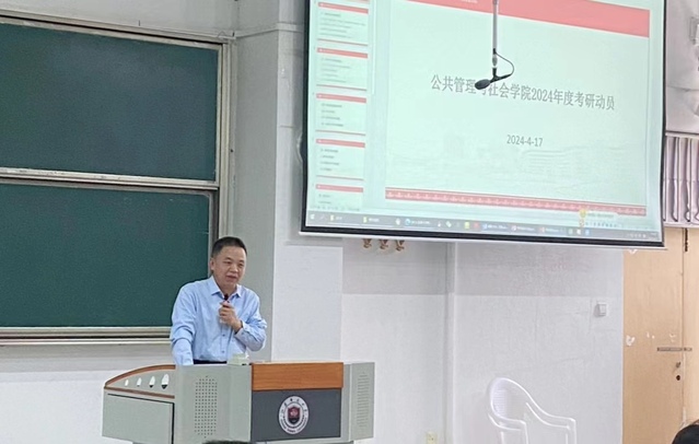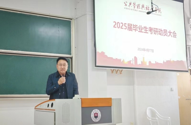 为了消除学院考研学子的备考困惑,为学生提供全方位的考研指导与支持。4月17日下午,公共管理与社会学院隆重召开了2025届毕业生考研动员大会,院党委吴迪书记、祝天智院长出席大会并作动员讲话。学院大三全体同学和班主任老师参加了大会,会议由徐作锋副书记主持。