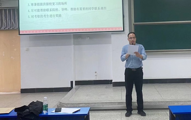祝天智院长作动员报告,他围绕为什么要考研究生、如何选择报考学校和专业、备考方法以及备考过程中最忌讳的几种心理和行为等六方面与学生们分享了宝贵的经验。同时,也详细介绍了学院为考研学生提供的支持政策,包括学习场所、导师指导、经费支持等,鼓励学生们在考研道路上坚定前行。