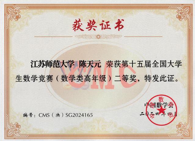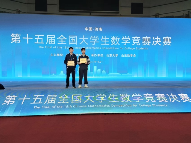 2024年4月19日-4月21日,第十五届全国大学生数学竞赛决赛在山东大学中心校区举行,我校2020级同学陈天元、王天宇参加了数学类高年级组比赛。在决赛考试中,两位同学发挥出色,分别获得了数学类高年级组二等奖、三等奖,江苏赛区在此组别比赛中共23名同学获奖。