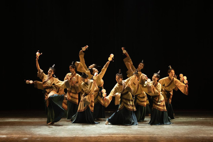 群舞作品《鼗鼓乐》以一柄二鼓的汉代鼗鼓为道具。汉代乐器“鼗鼓”,俗称“拨浪鼓”。舞蹈既有古朴庄重的仪式感,又富有现代创新的动态张力,生动再现了汉代的文化精神和艺术魅力。在力与美的交融中,感受那跨越千年的韵律之美。