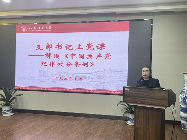 随后,研究生第二党支部书记邓张新老师为全体党员上了一堂生动的党纪党课。她结合党的纪律建设要求和学院实际,深入浅出地讲解了党的纪律体系、党的纪律要求以及党的纪律执行等方面的内容。邓老师的讲解既有理论高度,又紧密联系实际,使党员们对党的纪律有了更加全面、深刻的认识。