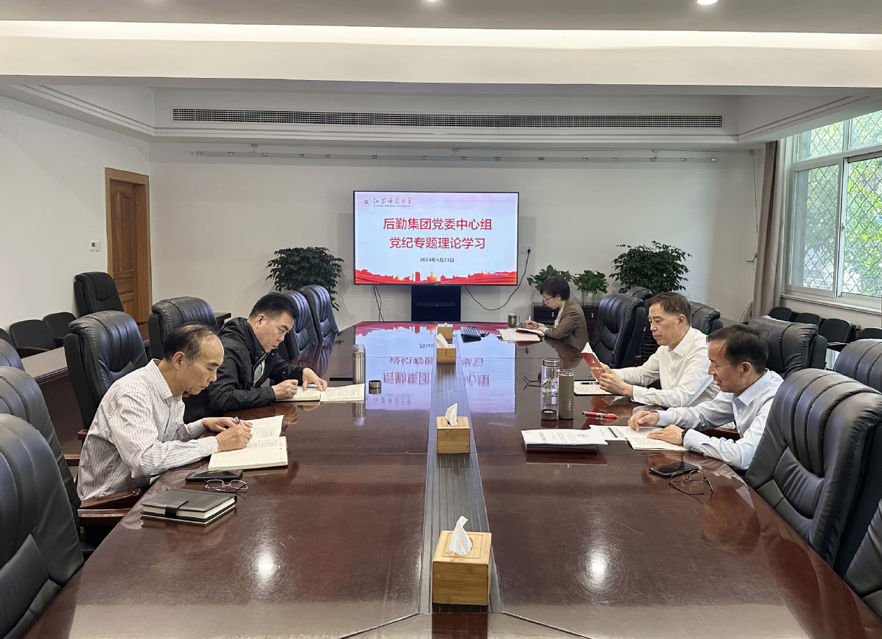 4月23日下午,后勤集团党委首次党纪学习教育专题读书班暨中心组理论学习会在会议室召开,集团领导班子全体成员参加学习研讨,集团党委书记蒋国杰主持并领学,副总经理陈国联作重点发言。