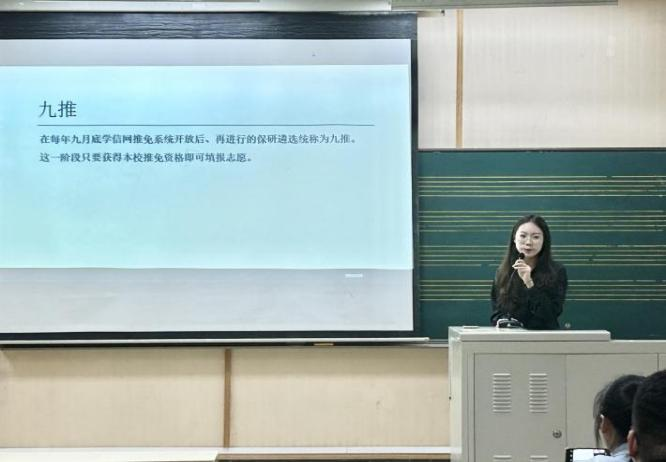 李轲鑫同学成功保研至本校,她主要从保研的要求,保研的途径,以及成绩占比的需求,从学习方法和学习态度的角度,对保研的注意事项和重要时间节点做了提醒,鼓励大家在大学阶段积极参与实践,多学习,多考证,多积累舞台经验。
