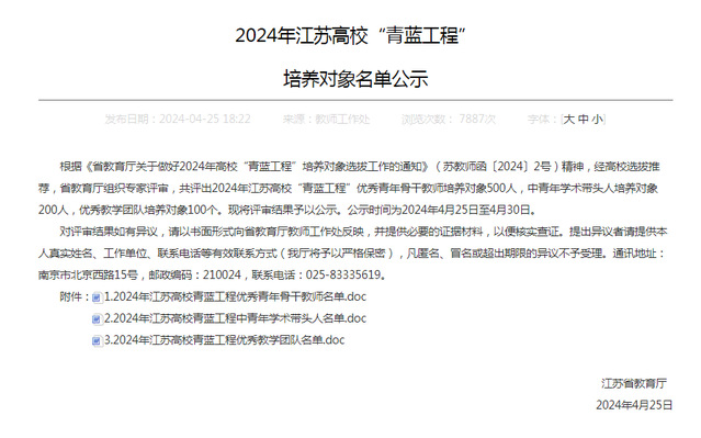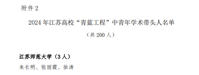 根据《省教育厅关于做好2024年高校“青蓝工程”培养对象选拔工作的通知》(苏教师函〔2024〕2号)精神,经学校选拔推荐,省教育厅组织专家评审,共评出2024年江苏高校“青蓝工程”优秀青年骨干教师培养对象500人,中青年学术带头人培养对象200人,优秀教学团队培养对象100个。其中,我院朱长明教授入选2024年江苏高校青蓝工程中青年学术带头人名单。