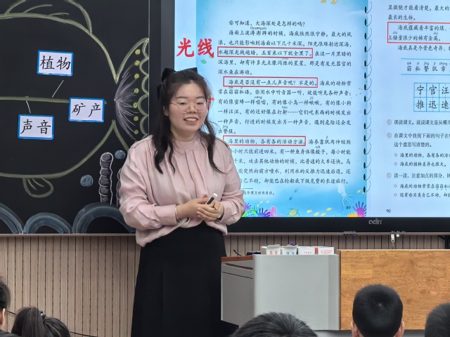 活动开始,王微老师和鹿明嫣老师分别从实用性阅读与交流任务群和思辨性阅读与表达任务群为主题执教三年级下册《海底世界》。王老师紧紧围绕“跟着《海底世界》学介绍”的主题,紧扣本单元的语文要素“了解课文是从哪几个方面把事物写清楚的”展开教学,通过引导学生借助关键语句概括一段话的大意,进而厘清课文的层次,再引领学生聆听动物的声音,帮助学生感受作者是怎样从几个方面把一个意思写清楚的,同时感受海底世界的奇妙。