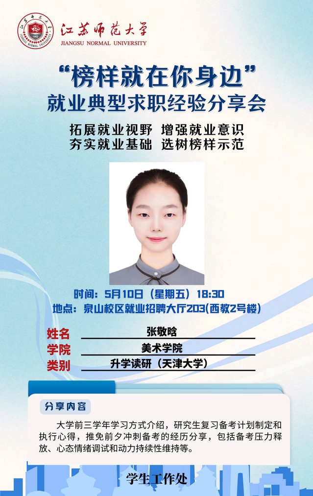 为增强学生就业意识,拓宽就业视野,夯实就业基础,学生工作处结合学生关注度高、求职意愿强烈的行业领域,开展“榜样就在你身边”就业典型求职经验分享会,充分发挥朋辈榜样的示范引领作用,帮助更多的学生提升就业竞争力。经学院推荐、学校遴选,现将第六期活动开展相关情况通知如下: