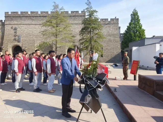 教官敬献花篮。全体师生鞠躬默哀,深切缅怀在抗日战争中牺牲的英勇烈士们。礼毕,王瑞校长整理绶带。