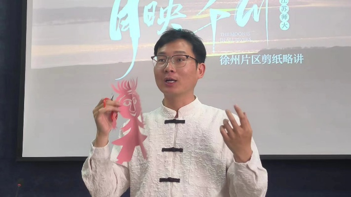 活动伊始,刘冠玉老师做了一场题为“‘月映千川’徐州片区剪纸略讲”的讲座,为在场的同学们揭开了剪纸艺术的神秘面纱。他以剪纸的用途作开篇,考虑到同学们对剪纸的认识或许只是停留在审美表面,从未接触过剪纸的实际效用,刘冠玉老师微笑着从随身的包中一件一件地变出了运用了剪纸工艺制成的精美作品——虎头鞋和虎头帽,详细介绍了剪纸在民间文化中的最初效用和广泛应用。