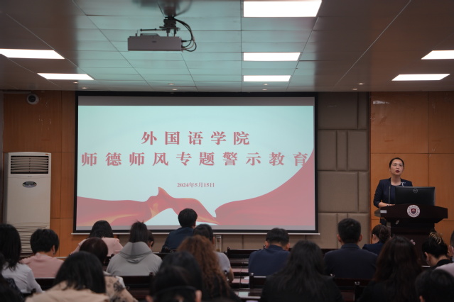 5月15日下午,外国语学院开展师德师风专题警示教育,全体教职工参加会议,会议由学院党委书记庄园主持。