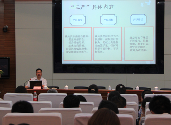 刘书记从“三严三实”的内涵、意义、要求三个方面展开党课讲授,详细阐释了“三严三实”的丰富内涵,深刻阐述了“三严三实”的重要意义,重点讲述了“三严三实”的总体要求。根据前期的调研结果,结合我院的实际状况,刘书记认真查摆我院党员干部在工作、生活、作风等方面“不严不实”的具体表现和存在的问题,深入剖析其产生的根源,指出其严重的危害,要求广大党员干部切实践行“三严三实”要求,发挥好先锋模范作用,为促进学院更好更快发展做出自己的贡献。