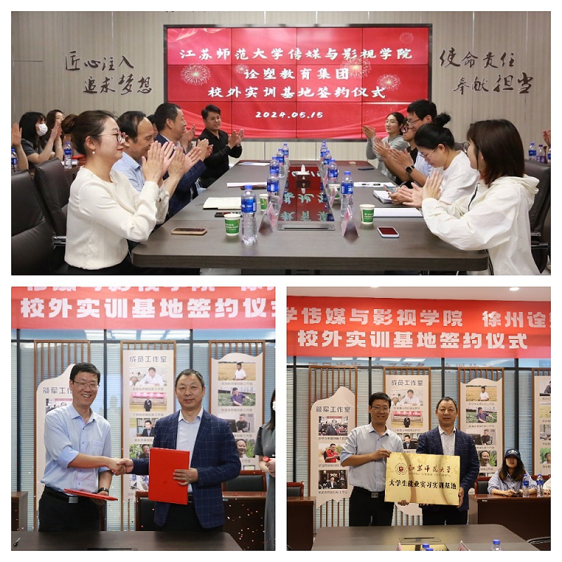 2024年5月15日下午,传媒与影视学院与徐州诠塑教育科技有限公司在校外实训基地铜山区乡村振兴展示馆开展座谈交流,并举行校企合作签约授牌仪式。