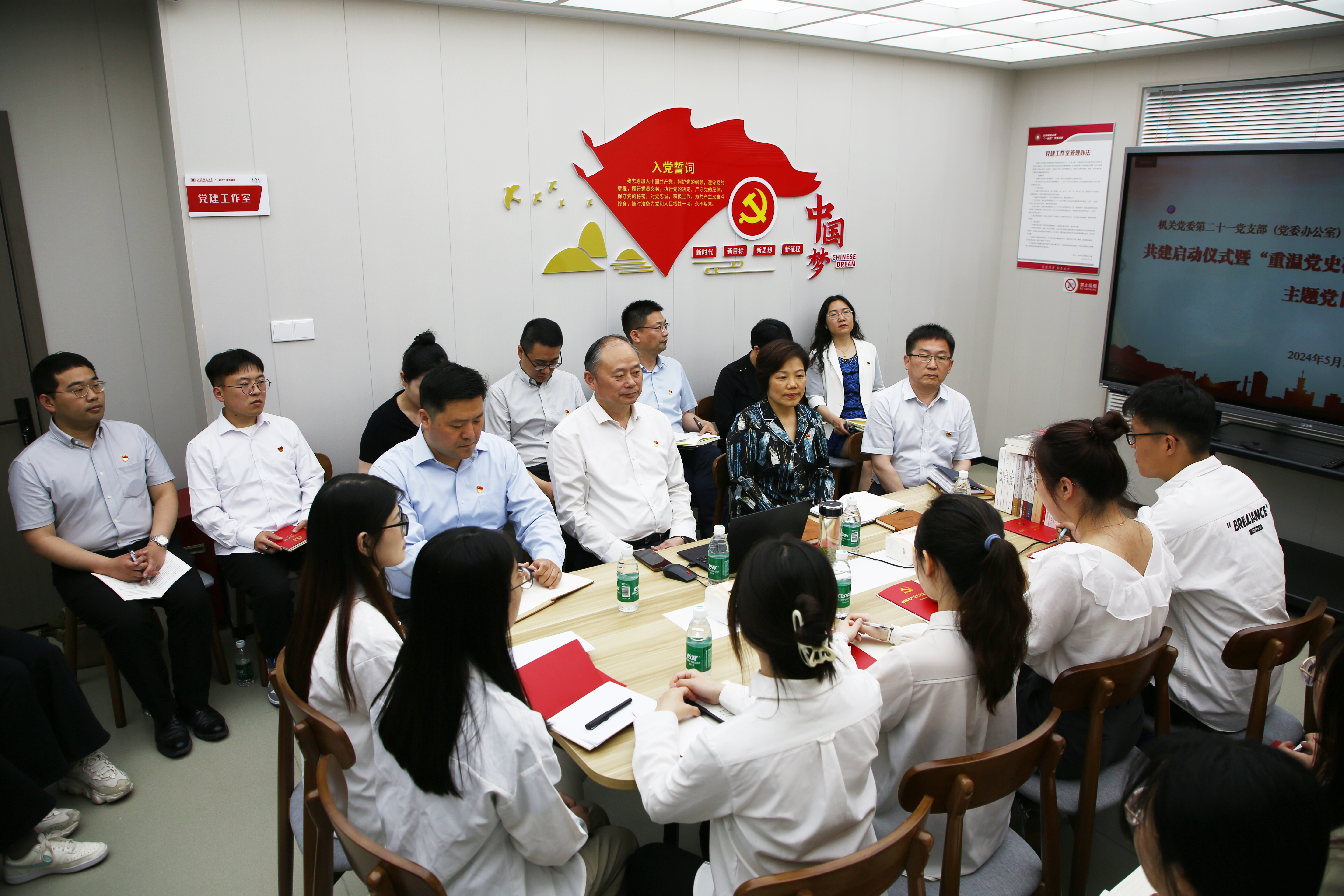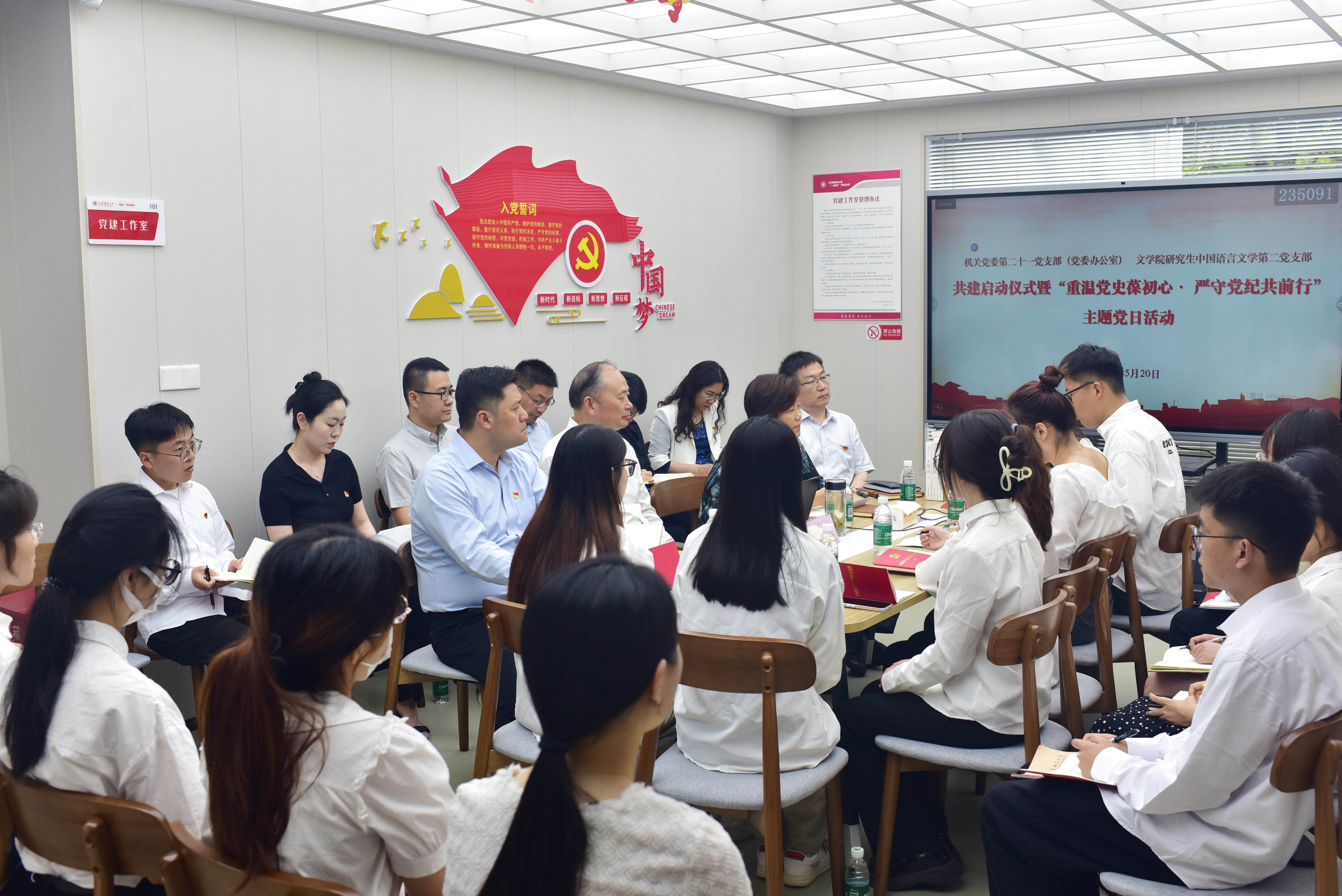 5月20日下午,机关第二十一党支部(党委办公室)与文学院研究生中国语言文学第二党支部在“一站式”学生社区举行共建启动仪式暨“重温党史葆初心·严守党纪共前行”主题党日活动。校党委书记方忠以普通党员身份参加支部活动。校机关党委书记王丰,文学院党委书记葛大伟、副书记彭晨应邀参加活动。