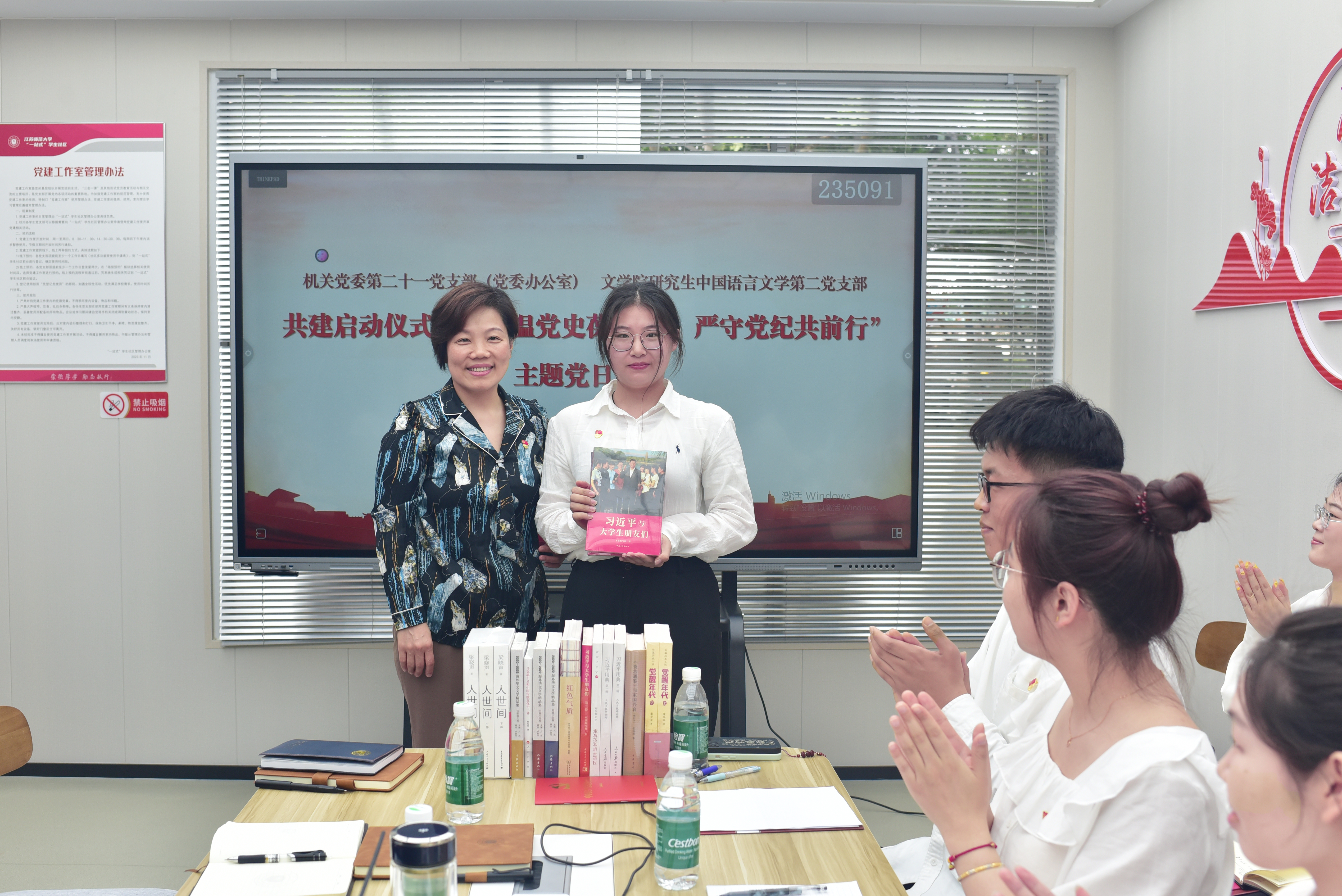 共建启动仪式上,机关第二十一党支部书记赵玉苏、文学院研究生中国语言文学第二党支部书记张原睿分别了介绍本支部情况,赵玉苏代表支部向学生党支部赠送了学习书籍。