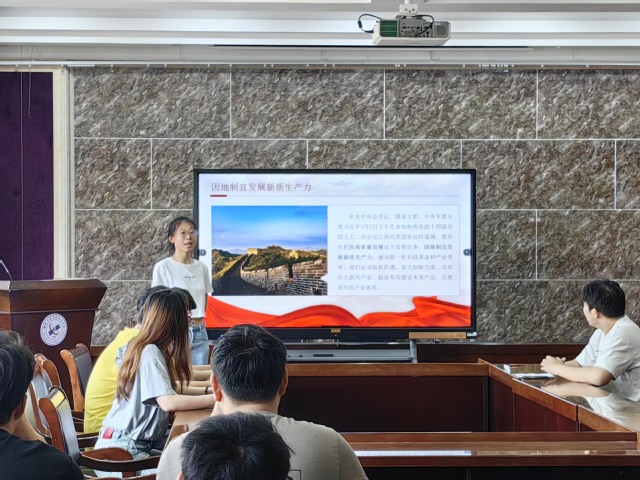 支部副书记首先解读了“新质生产力”的核心内涵,即以科技创新为主导,摆脱传统增长路径的束缚,符合高质量发展的要求,同时在数字时代展现出更强的融合性,建议工科研究生要关注社会热点行业和新兴产业,锚定发展方向,增强就业技能,主动融入社会发展需要,以“不畏浮云遮望眼”的智慧与“乱云飞渡仍从容”的定力时刻鞭策自身,在推动新质生产力发展的道路上踔厉奋发、勇毅前行。