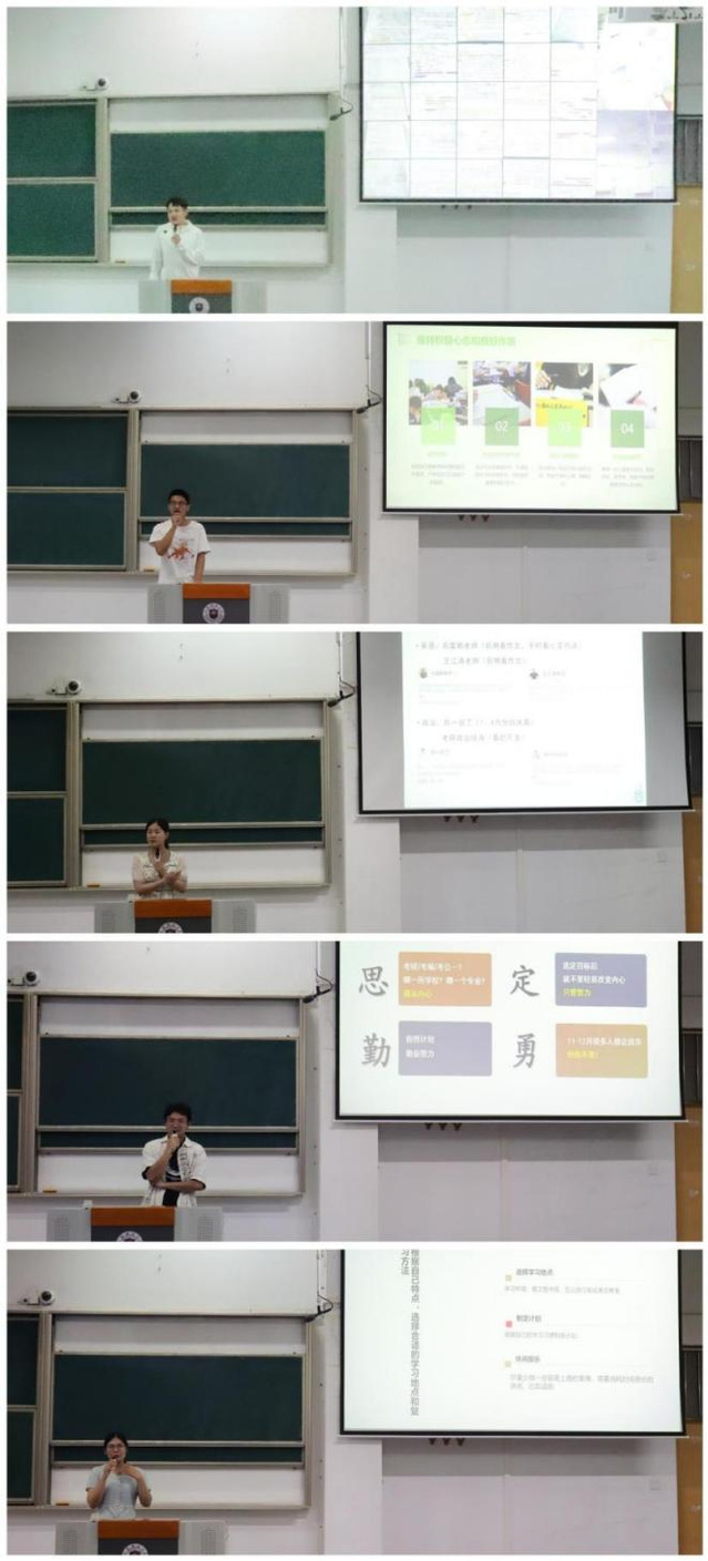 张春雷结合学院研究生招生工作,对研究生报考和如何备考进行指导,对同学们考研择校方向给予建议。李延延介绍了学院2024届学生考研整体情况,鼓励同学们尽快确定目标院校,提前做好细致规划。5名优秀毕业生学生代表结合备考经历,从考研动力、备考方法、考试技巧、心理调适等方面作了经验分享。