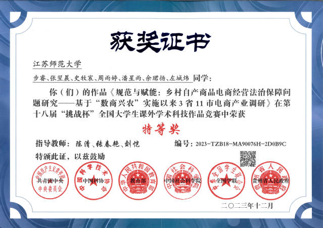 Ø 学院聚焦人才培养特别是创新创业领域,大力推动学生创新创业团队培育、孵化和指导教师队伍建设,组织学生积极参加高水平竞赛、开展法律援助服务,以赛促学,实践育人。学生团队科研项目斩获第十八届“挑战杯”全国大学生课外学术科技作品竞赛国赛特等奖,实现了重大突破,创造了我校哲学社会科学类作品参与该项赛事主体赛的历史最好成绩;学生志愿服务团队荣获江苏省高校青年志愿服务项目大赛金奖并挺进国赛。