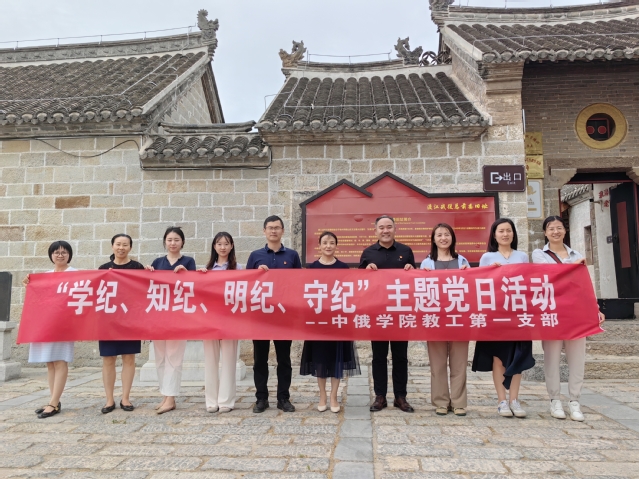 5月29日,江苏圣理工学院-中俄学院教工第一支部全体党员赴渡江战役党史纪律教育基地进行现场研学,并在教育基地会议室开展党纪学习教育专题暨支部书记讲党课活动。专题党课由支部书记马霄同志主讲,党委书记尹燕萍同志以普通党员身份参加会议。