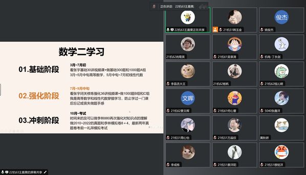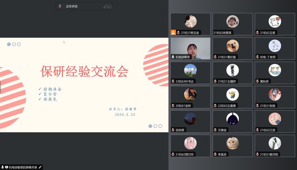 20机51班徐敏翠从个人情况、推免条件、暑期夏令营、联系导师、完善简历等五个方面和同学们交流了保研经验。20机61班的龙烨从个人情况、院校选择、备考经验分享与以心态调整四个方面与大家做了交流,她通过自身经历告诉大家要注重考研规划,保持自信。22机63班王晨栗、潘智超、邱弈霖三位同学着重分别从如何选择目标院校、考研专业课复习、考研公共课复习、复习状态调整等方面做了经验交流。