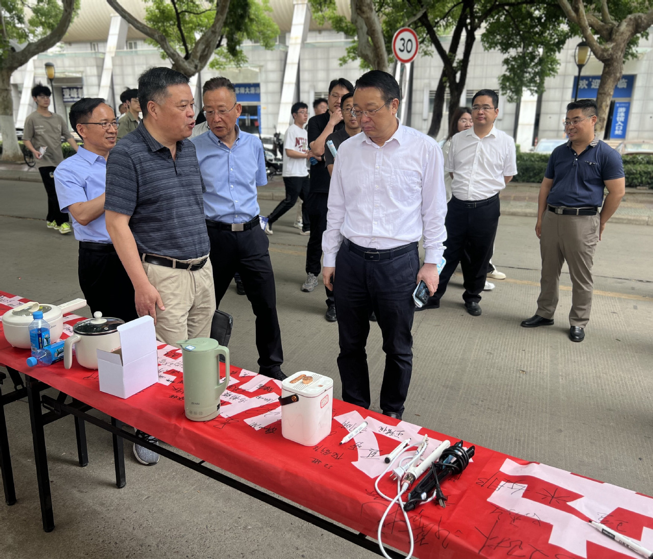 本次活动现场设有宿舍违章电器展示区、主题条幅签名区、消防安全海报展览区、消防演示体验区等四个板块。活动过程中,师生代表们参观了公寓典型违章电器实物展,观看了学生公寓消防安全教育与火灾案例图片展,在消防员的带领下参观了消防车,共同在“生命有爱、火灾无情 校园安全你我同行”横幅上承诺签名,纷纷表示要从我做起、从身边小事做起,坚决杜绝火灾隐患,共同营造安全的公寓环境。