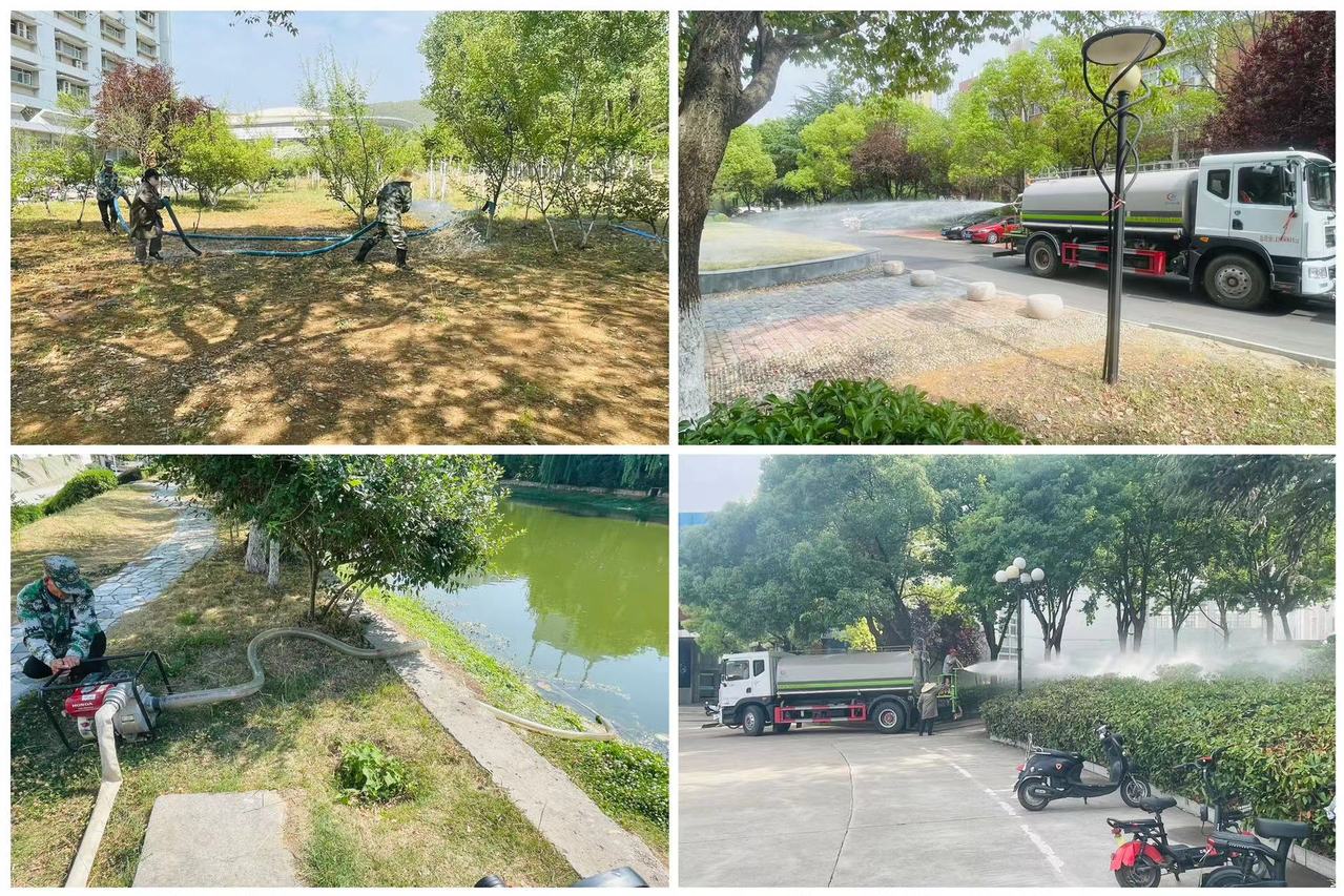 物业服务中心绿化班组全体人员全力以赴,顶着酷暑高温,分工合作,充分利用抽水泵、洒水车等多种浇灌方式,多措并举,做到抗旱不停步,浇灌无死角。此次抗旱物业服务中心抽调移动水泵3台、洒水车2台抽取玉泉河水,从早上7点至晚上7点进行浇灌作业,每日浇水量达260余吨,给植物降温增湿,缓解高温干旱对校园绿植的影响。