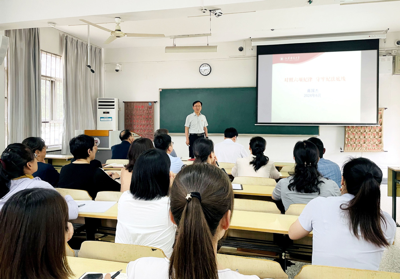 为深入贯彻全面从严治党要求,加强党员干部的党性教育和纪律建设,6月6日下午,后勤集团党委书记蒋国杰以《对照六项纪律 守牢纪法底线》为题讲授党纪学习教育专题党课,后勤集团全体党员和中层管理干部60余人参加学习。