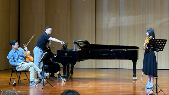 专家课上,金辉教授、梁晟铭博士对我院选拔的学生们进行了专业和细致的指导,对我院学生的专业水平、教师的教学质量等均给予了充分的肯定。与此同时,也指出了学生们在演奏过程中的不足之处,并进行了详细的引导与示范。从音乐风格的把握、呼吸与动作的配合、音色的控制等方面给出了建议,并强调了“左手冷静,右手热情”等要素在演奏中的重要性。