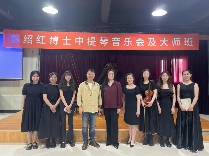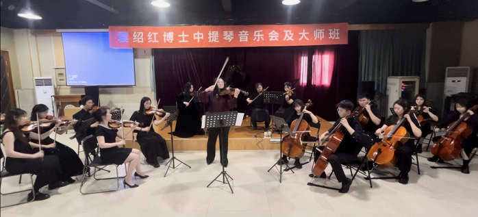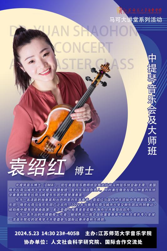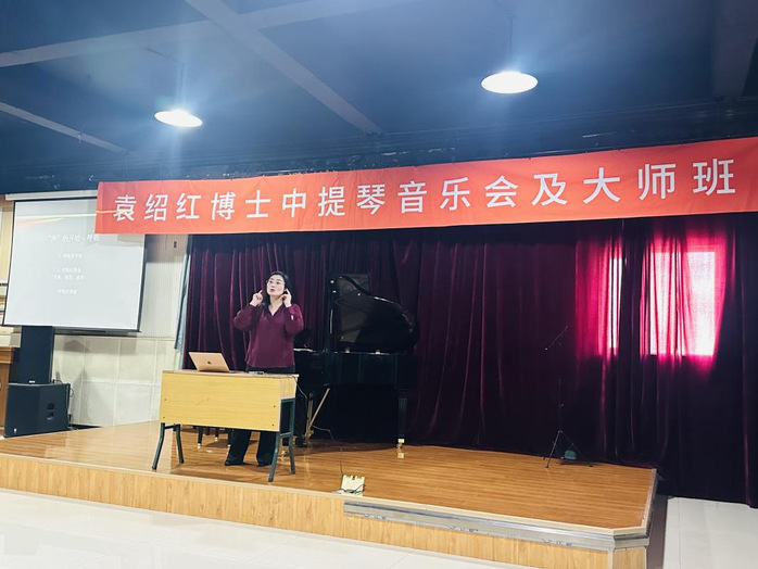 5月23日下午14点30分,身为美国弦乐教师协会俄克拉荷马州弦乐协会副主席的袁绍红博士的中提琴音乐会及大师班,在江苏师范大学音乐学院405B演奏厅圆满成功举行。此次大师班属于《马可艺术大讲堂》系列活动,也是国家一流本科专业音乐学建设支持项目之一。我院领导王志军院长、崔飞副院长、郭威副院长,以及音乐学院部分师生、周边地区的提琴教师与弦乐爱好者们一同聆听了此次音乐会。音乐学院郭威副院长介绍了袁绍红博士的主要艺术成就,并代表我院全体师生向袁博士的到来,表示了热烈欢迎。
