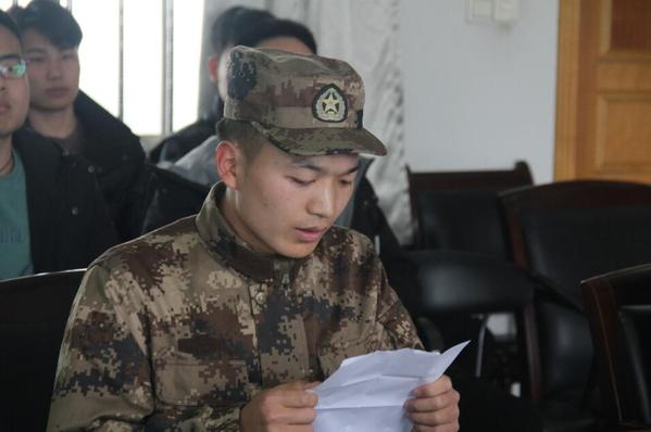 新兵周财首先在欢送会上发言,他讲述了自己报名参军的心路历程,表达了要牢记保家卫国的光荣使命,在军营中锻炼体质、磨练意志,为军旗添彩、为母校争光的强烈意愿。退伍学生王茂分享了自己在西南地区服役的经历,寄语入伍新兵在部队的熔炉里百炼成钢,希望周财听党话,跟党走,锐意进取,争做标兵,把握人生机会,肩负神圣使命,用青春和热血自觉践行强军目标。