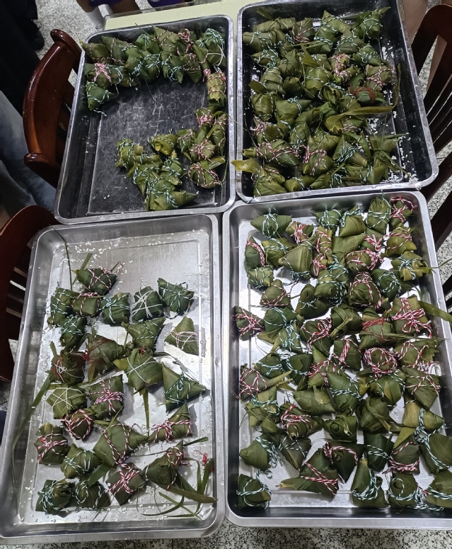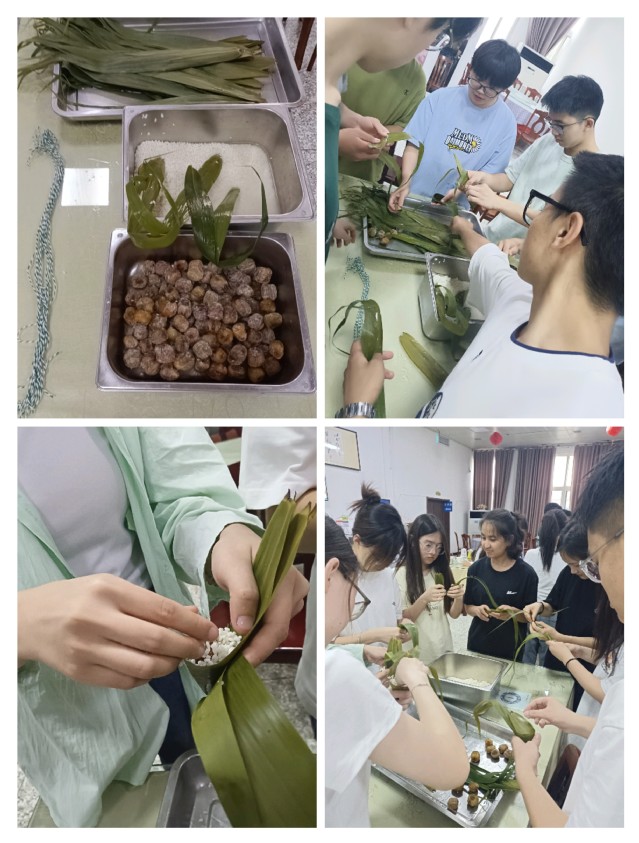 活动二,辅导员常蒙带领全班学生在教工食堂举办了“浓情蜜意,‘粽’享欢乐”包粽子活动。后勤老师为大家准备了粽叶、糯米、蜜枣等材料。包粽子分组进行,手法娴熟的同学教授其他同学,粽叶飘香,气氛和谐。在一双双巧手下,清香的粽叶和晶莹的糯米变成了一个个诱人的粽子。