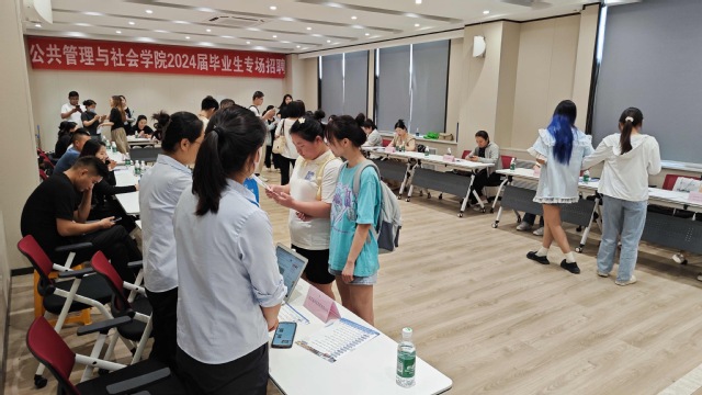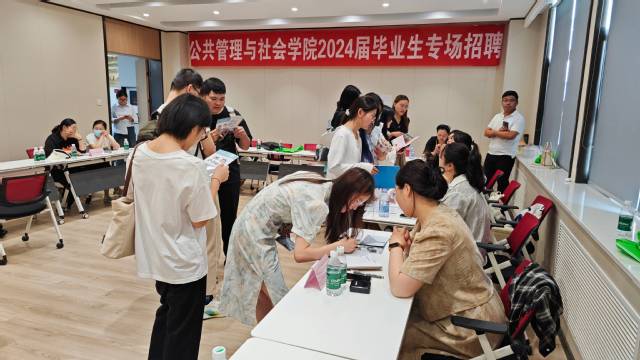为拓宽毕业生就业渠道,进一步提升就业质量,6月12日上午,公共管理与社会学院在500报告厅举办了2024届毕业生专场招聘会。此次招聘会邀请了江苏九旭药业有限公司、亚太冷(徐州)国际供应链管理有限公司等16家用人单位,学院众多毕业生前来参会咨询。
