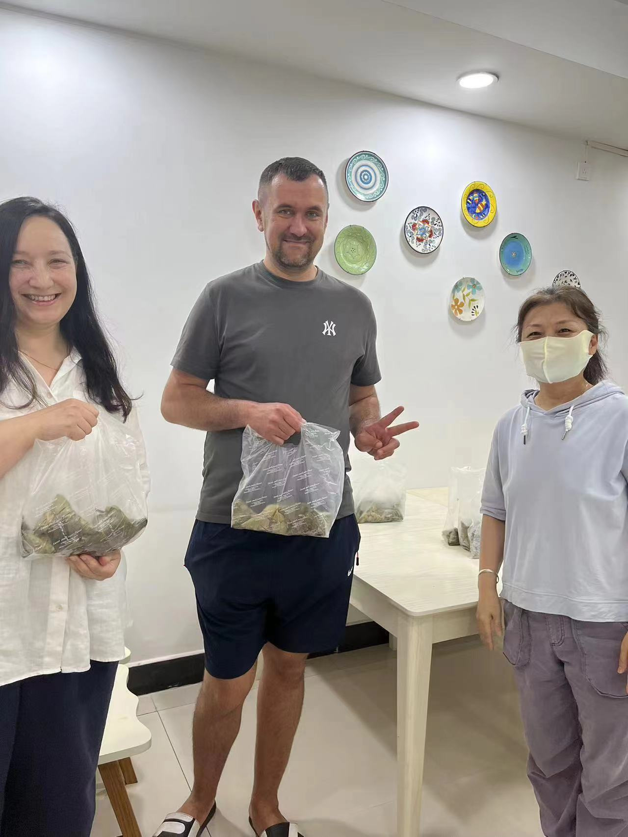 饮食服务中心高级技师刘保国在活动开始前先和大家一起重温端午节的各种习俗,并鼓励在场的各位同学弘扬伟大爱国诗人屈原“路漫漫其修远兮,吾将上下而求索”的进取情怀。活动开始后,刘主任现场讲授包粽子的方法与步骤,资深的包粽子阿姨在一旁演示。糯米、粽叶、馅料(红枣、黑豆、红豆、花生等)、线绳,原本散落的食材在一双巧手的操作下变成了一个个玲珑的糯米粽,有三角粽、 四角粽、长粽、塔型粽、穿针粽五种形状。两排的同学们在观摩的同时早已按捺不住跃跃欲试,每组同学在饮食中心工作人员和公寓中心值班员的指导下开始动手包粽子。虽然同学们包出的粽子形态各异,“漏米百出”,但每一个人脸上都洋溢着兴奋与开心!活动后每个参与的同学都领到了自己的劳动果实并与其同学们分享,到场的中俄学院外教们也分享了包粽子乐趣。