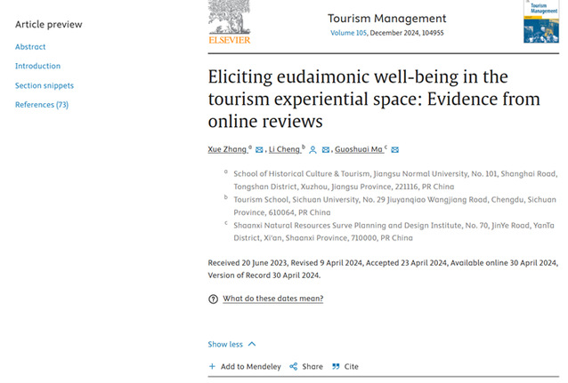近日,历旅学院张雪老师与四川大学程励教授等在《Tourism Management》期刊上发表重要论文,江苏师范大学为第一署名单位,张雪老师为第一作者。该期刊作为国际公认的旅游管理研究领域三大顶级期刊之一,享有崇高的声誉和广泛的影响力。根据JCR最新报告,该杂志被归类为Q1期刊,影响因子为12.7。