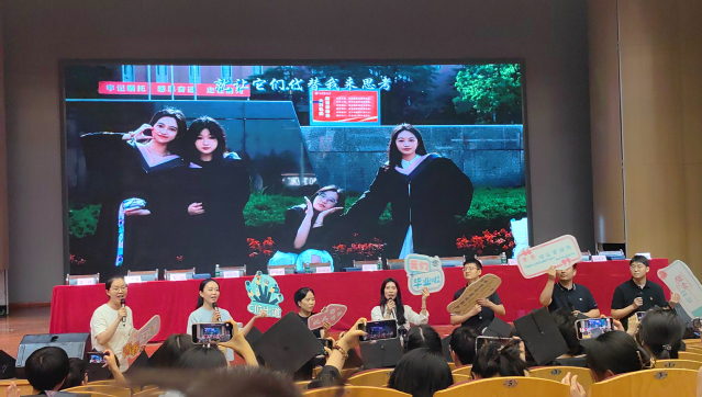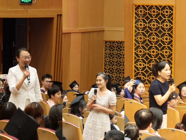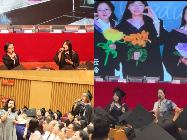 张宁老师、王丹老师、邱婷婷老师与毕业生代表倾情演唱的英、日、西多语种歌曲,带领同学们回顾在外院的青春岁月,感受那份外语的执着与热爱,共同铭记这段难忘的时光。