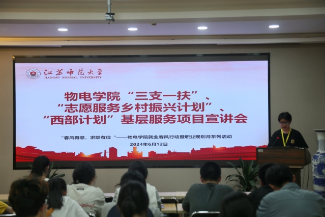 2024年6月12日下午,物电学院在7#327会议室成功举办“三支一扶”、“志愿服务乡村振兴计划”以及“西部计划”基层服务项目宣讲会,旨在帮助学生了解基层服务项目政策,激励更多有志青年投身乡村振兴事业,为国家基层事业的发展贡献青春力量。