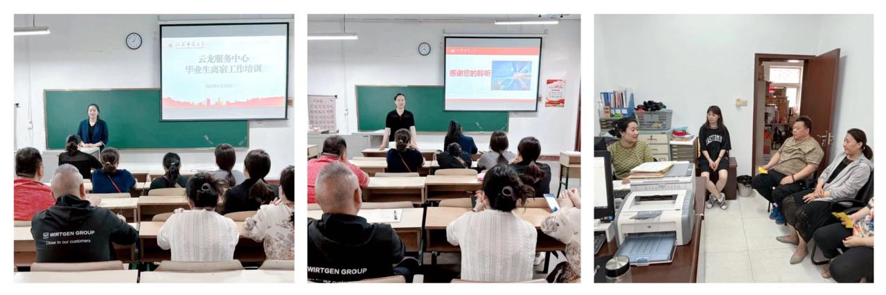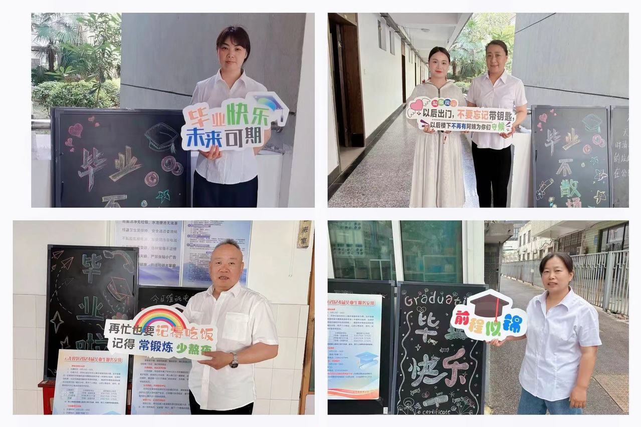 全心全意周密部署毕业生离校时间相对集中,各项工作必须做到齐头并进。为做好毕业生文明离校工作,云龙服务中心按照相关要求做了充分的准备:一是开展毕业生离宿工作培训,提前详细安排,周密部署,细化分工,要求全体工作人员做好各项离校退宿准备工作;二是中心管理人员排班值守,加强毕业季期间安全巡查;三是在毕业生楼宇张贴《云龙校区2024届毕业生服务安排》,向毕业生传达毕业相关办理流程、注意事项和服务提醒;四是加强毕业生寝室的走访和管理,加大检查力度,同时提醒毕业生注意保护自己的人身和财产安全;五是利用条幅、小黑板等营造温馨、暖心的毕业氛围,倡导文明离校。
