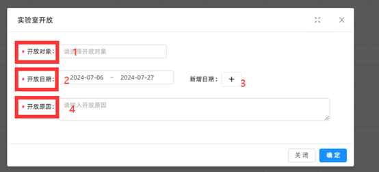 2.实验室安全信息系统于6月24日将所有实验室状态设为“关闭中”。需要开放的实验室,实验室安全责任人于6月24日—6月30日完成线上申请,选择实验室开放时间段。二级学院管理员7月2日前完成审核。获得开放批准的实验室状态调整为“开放中”。