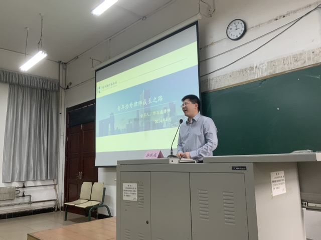 2024年6月24日下午,北京浩天(深圳)律师事务所合伙人、广东省涉外律师先锋人才郭振威律师莅临我院,为法学院大一学生作了题为“青年涉外律师成长之路”的专题讲座,会议由法学院梁庭瑜博士主持,法学院部分老师、23法15涉外法治实验班以及大一其他班部分同学参加了听讲。