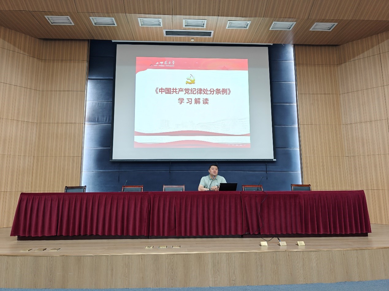 会上,葛大伟从《条例》修订的时代背景、核心内容、实践要求三个方面进行了重点解读,要求全体党员必须深刻领会《条例》修订的时代背景与重大意义,精准把握《条例》的核心内容与精神实质,强调全体党员教师要在今后的工作生活中始终紧绷“思想弦”,坚定理想信念,坚守教育初心,始终苦练“理论功”,不断夯实理论基础,学习《条例》最新的修改内容,做到常学常新、学以致用;始终恪守“两条线”,在师德师风底线、党纪国法红线上做清醒人、明白人,慎独修身,一心纯净,把增强党性、严守纪律、砥砺奋进融入日常、形成习惯,不断推动全院各项重点工作落地见效,积极助力学院事业的高质量发展。