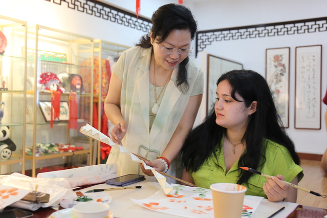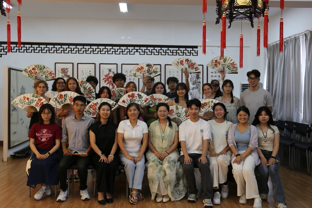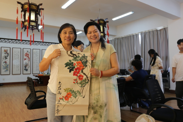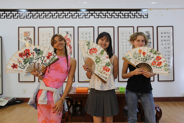 6月26日,美术学院精心组织了书法和国画文化体验活动。在书法体验环节,学生们在老师的指导下挥毫泼墨,感受了中国传统书法艺术的魅力。他们逐渐掌握了书法的要领,笔下的字迹也愈发流畅、自然。一堂课的功夫,一幅幅精美的书法作品逐渐呈现在眼前。有的作品笔力遒劲,气势磅礴;有的作品清新淡雅,飘逸洒脱。随后,学生们又开始了国画文化的探索之旅。他们以精美的折扇为绘画载体,在老师的指导下,学生们纷纷拿起毛笔,蘸上颜料,开始在折扇上描绘“凌霄”这一经典国画题材。学生们的画作逐渐成型,有的折扇上,凌霄花娇艳欲滴,枝叶繁茂;有的则着重表现了凌霄花的攀援之势,笔触灵动,气势磅礴。每一幅作品都展现出了他们对国画艺术的独特理解和创造力。