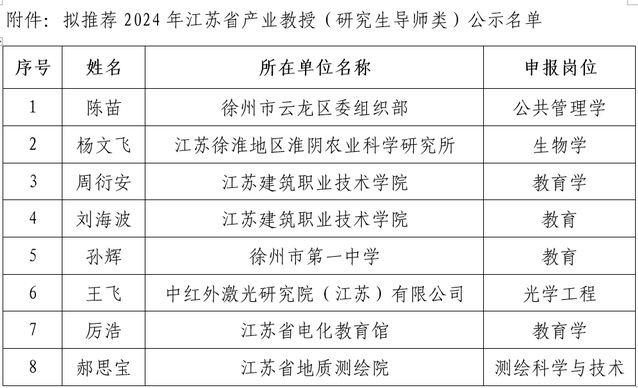 根据《省教育厅等四部门关于开展2024年江苏省产业教授(兼职)选聘工作的通知》(苏教研函〔2024〕4号)和《江苏省产业教授(研究生导师类)选聘办法》(苏教规〔2021〕3号)文件精神及要求,经个人申请、学院推荐、研究生院审核,现将我校拟推荐申报2024年江苏省产业教授(研究生导师类)名单予以公示。公示期间如有异议,请向研究生院反映。