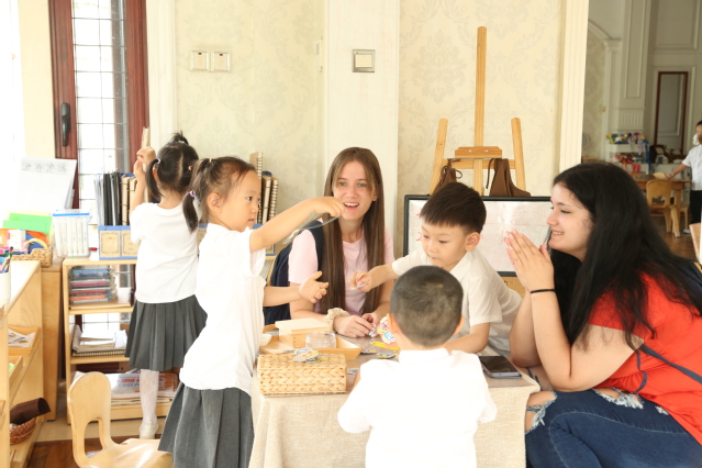 随后,美国学生们观摩了幼儿园的蒙氏教育操作,这种教育方法强调自主学习和探索,与他们所熟悉的教育体系形成鲜明对比。在英语互动环节,美国学生与幼儿之间的交流不仅锻炼了语言能力,更亲身体验了双语教学的实践和魅力。