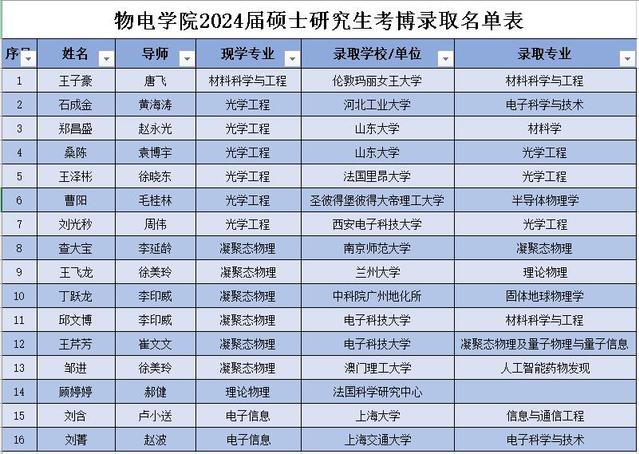 物电学院2024届硕士研究生考博捷报频传,截至目前,学院2024届硕士研究生共有16人考取博士研究生,升学人数再创历史新高。其中,有5名研究生被法国里昂大学、伦敦玛丽女王大学、圣彼得堡彼得大帝理工大学等境外高校录取。学院量子功能材料设计与应用实验室凝聚态物理和理论物理专业7名研究生取得全员考取博士佳绩。
