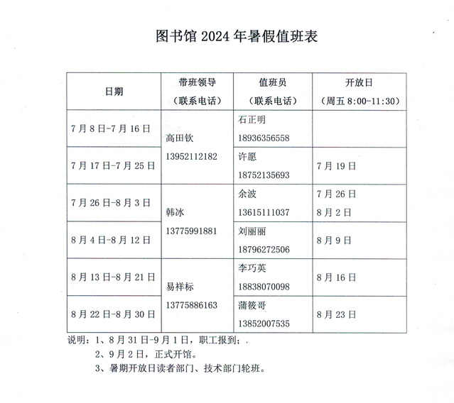 根据学校暑假工作安排要求,结合图书馆工作实际情况,现将暑假开放做如下安排: