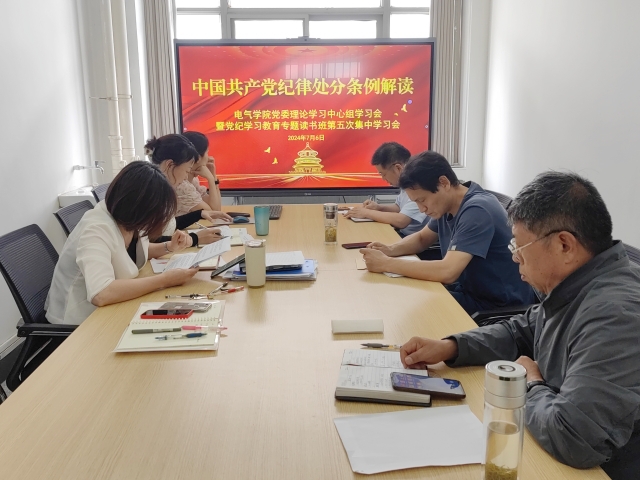 7月6日上午,电气学院党委召开理论学习中心组学习会暨党纪学习教育专题读书班第五次集中学习会,院党委理论学习中心组全体成员参加学习。会议由院党委书记潘震鑫主持。