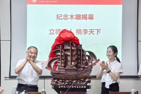 随后,举行了“立德树人 桃李天下”纪念木雕捐赠揭幕仪式,屠院长与校友代表季红共同为八零级全体校友捐赠的纪念木雕揭幕。赵书记向各位校友介绍学校及学院校友工作进展和智慧校友平台建设情况,现场指导广大校友加入校友平台,并邀请校友们再回师大、常回化院。
